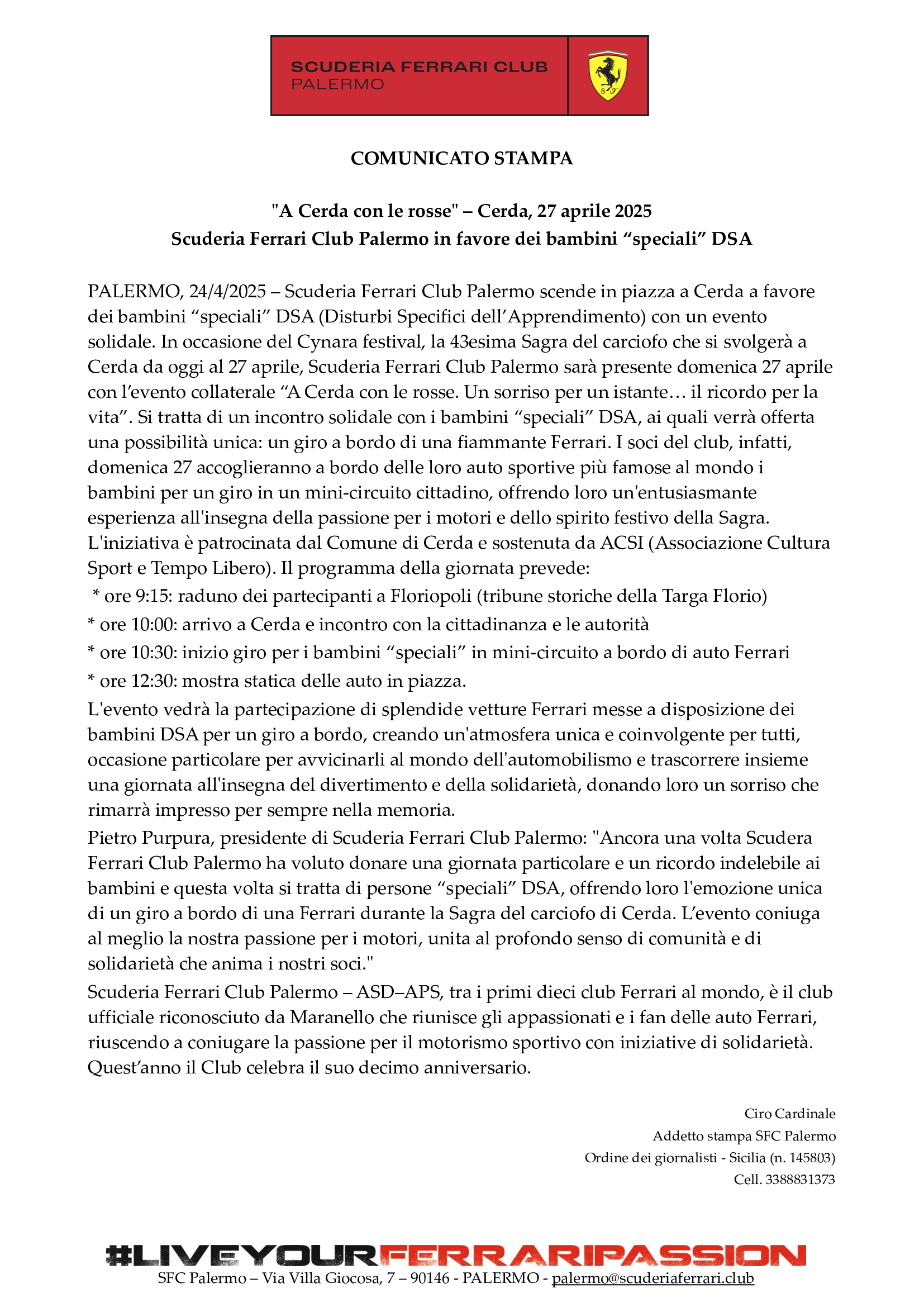 PALERMO, 24/4/2025 – Scuderia Ferrari Club Palermo scende in piazza a Cerda a favore dei bambini “speciali” DSA (Disturbi Specifici dell’Apprendimento) con un evento solidale. In occasione del Cynara festival, la 43esima Sagra del carciofo che si svolgerà a Cerda da oggi al 27 aprile, Scuderia Ferrari Club Palermo sarà presente domenica 27 aprile con l’evento collaterale “A Cerda con le rosse. Un sorriso per un istante… il ricordo per la vita”. Si tratta di un incontro solidale con i bambini “speciali” DSA, ai quali verrà offerta una possibilità unica: un giro a bordo di una fiammante Ferrari.