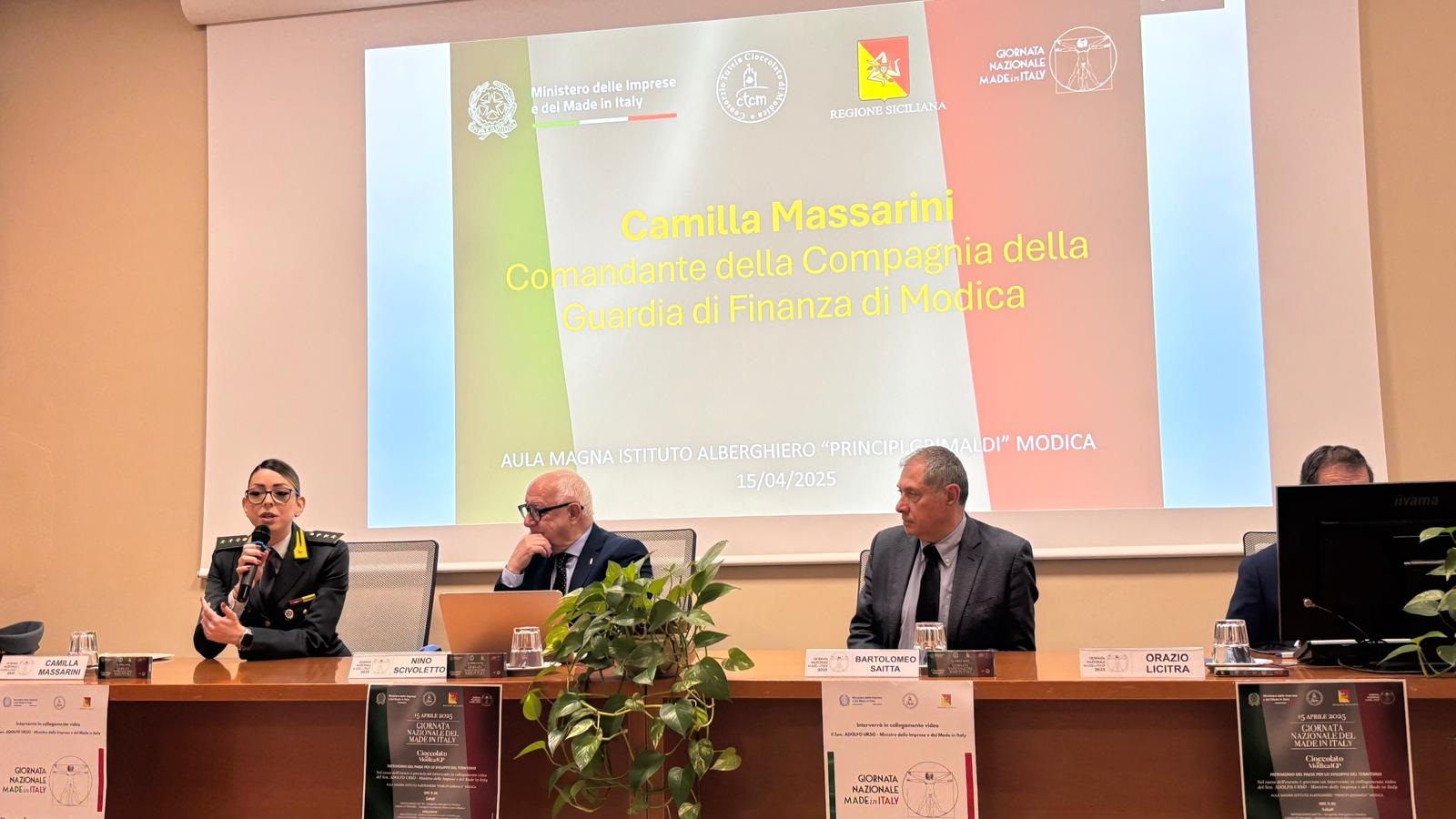 Sono seguiti gli interventi in presenza del Capitano Comandante Compagnia Gdf Modica CAMILLA MASSARINI, che si è ampiamente soffermata sul valore della produzione del Made in Italy nel settore agroalimentare illustrando tutte le iniziative a livello nazionale poste a tutela delle indicazioni Geografiche da parte della Guardia di Finanza. Appello ai giovani a diffidare dai facili acquisti di prodotti a scapito della qualità certificata.