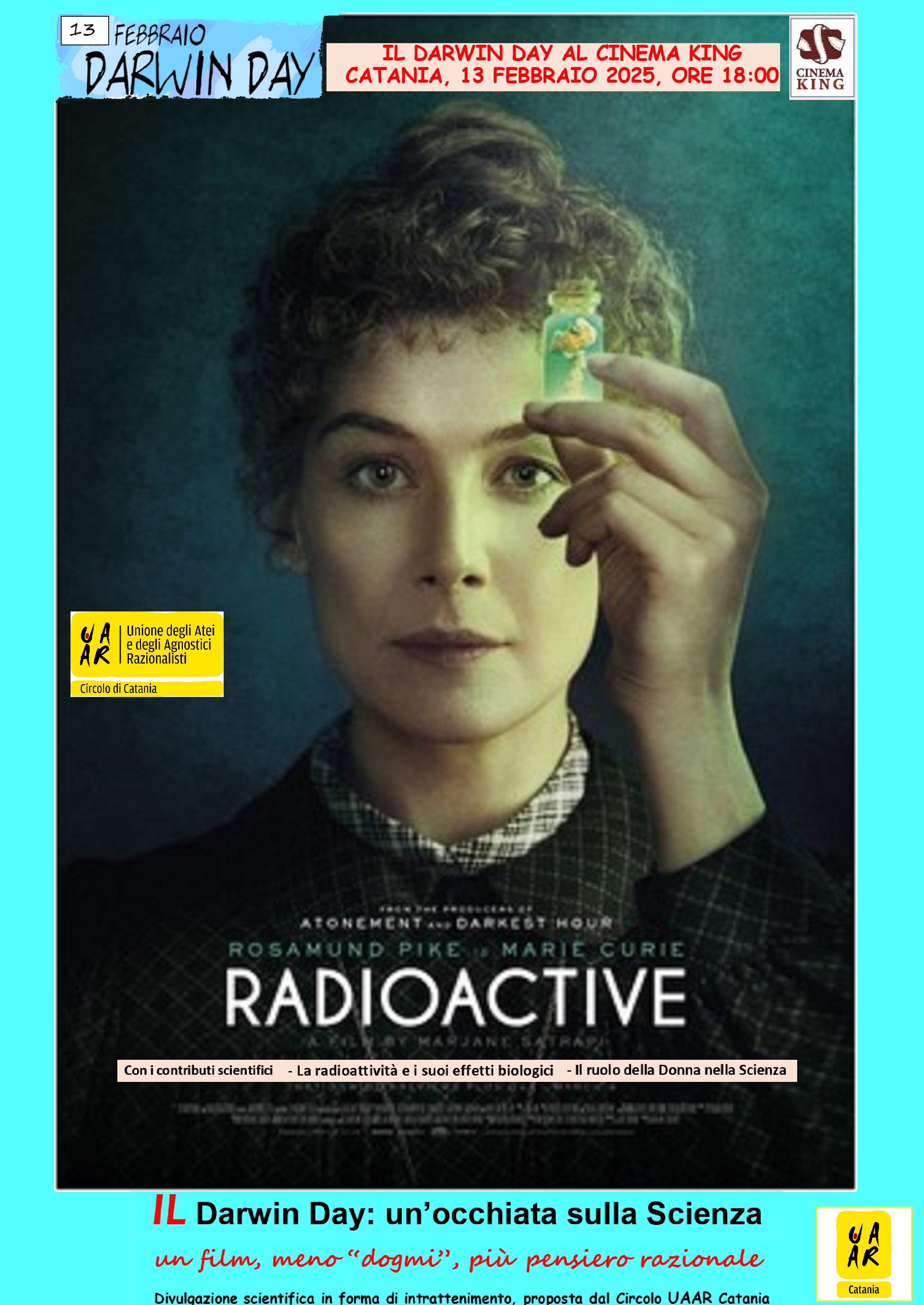 Il 13 febbraio 2025, in collaborazione con il cinema King, il Circolo Uaar di Catania propone il film inglese “Radioactive” sulla vita di Maria Skłodowska-Curie e del marito Pierre: le loro scoperte sulla radioattività, premiate con il Nobel; la difficile affermazione di una donna nell’ambiente accademico e nel mondo della scienza; l’importanza della ricerca per migliorare la condizione dell’uomo; la libertà da pregiudizi, da convenzioni, dagli schemi culturali precostituiti.