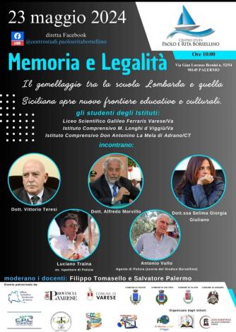 A trentadue anni dalla Strage di Capaci, il 23 maggio 2024 alle 10 presso la sede del Centro Studi Paolo e Rita Borsellino di Palermo, in via Bernini 52/54, si terrà un incontro-dibattito dal titolo “Memoria e Legalità”, organizzato insieme al Liceo Scientifico “Galileo-Ferraris” di Varese, all’Istituto comprensivo “M. Longhi” di Viggiù (Va) e l’Istituto comprensivo “Don Antonino La Mela” di Adrano (Catania).