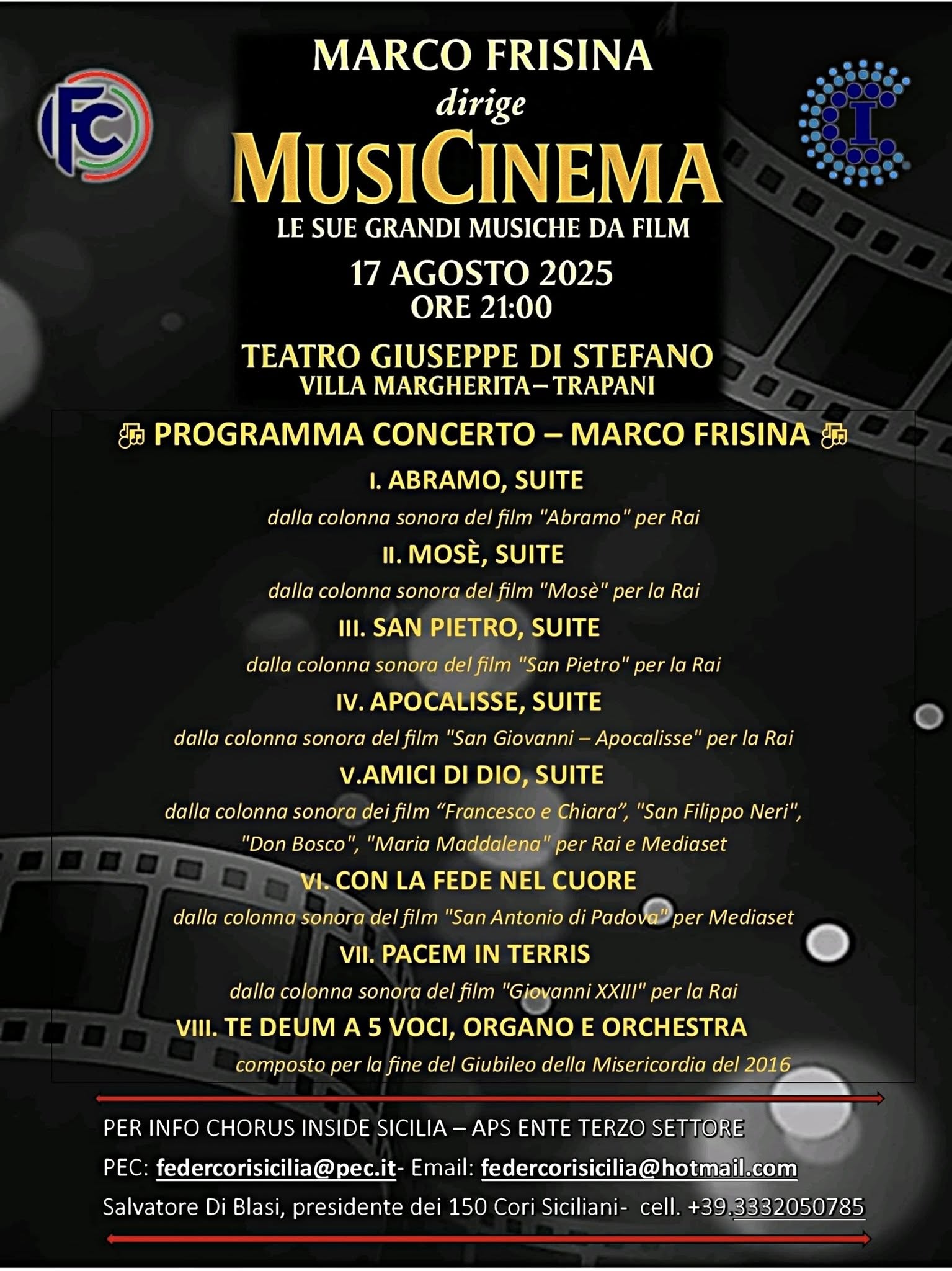 Il 17 agosto alle ore 21, al Teatro Giuseppe Di Stefano, nella Villa Margherita a Trapani, si terrà il concerto evento MUSICINEMA, un incontro straordinario tra immagini e suoni, tra spiritualità e arte, che ha il cuore pulsante nella bellezza della musica e nella forza del racconto cinematografico, che vedrà protagonisti 120 artisti siciliani tra cori e orchestra, appartenenti al CORO CHORUS INSIDE SICILIA DI TRAPANI, al CORO LIRICO LAUDATE DOMINUM DI BAGHERIA, all’ORCHESTRA SINFONICA BEQUADRO DI BAGHERIA, di cui è Maestro Salvatore Di Blasi, diretti dal Maestro Marco Frisina.