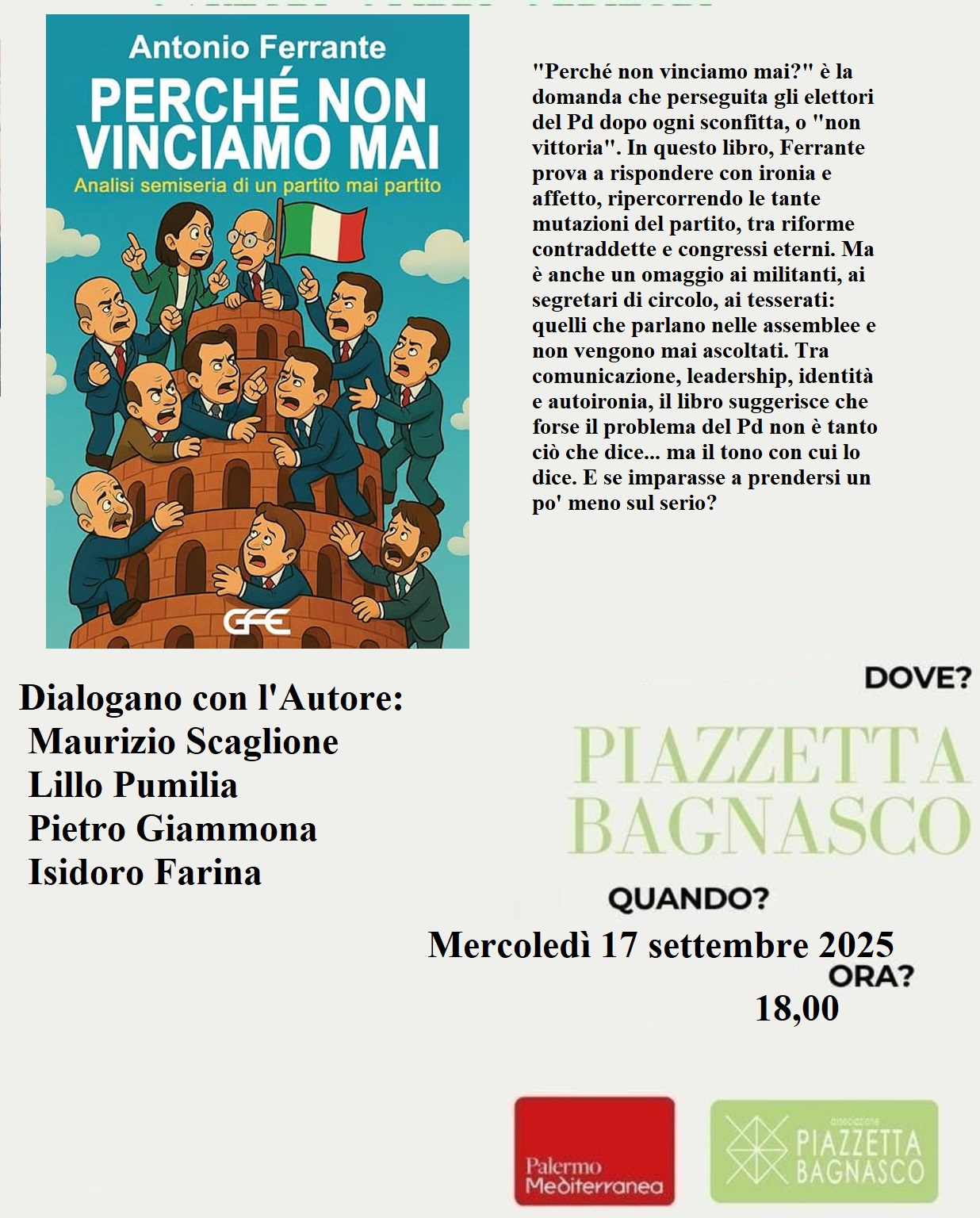 “Perché non vinciamo mai?” sarà presentato alle 18 di mercoledì 17 settembre in piazzetta Bagnasco. A interagire con l’autore saranno: Isidoro Farina, Pietro Giammona, Lillo Pumilia, Maurizio Scaglione.