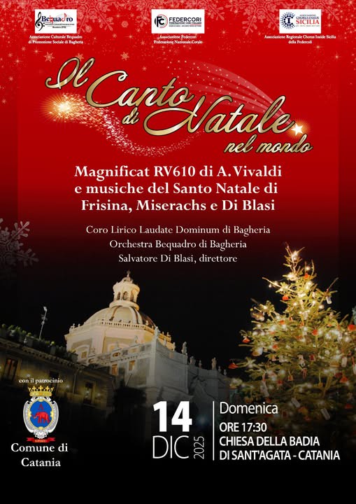 Domenica 14 dicembre, alle ore 17.30, alla chiesa Badia di Sant’Agata a Catania, avrà luogo uno degli appuntamenti musicali più attesi del Cartellone del Natale Catanese 2025: il concerto che vedrà protagonisti l’Orchestra Bequadro, il prestigioso Coro Laudate Dominum di Bagheria diretti dal Maestro Salvatore Di Blasi, figura di rilievo nel panorama musicale siciliano.