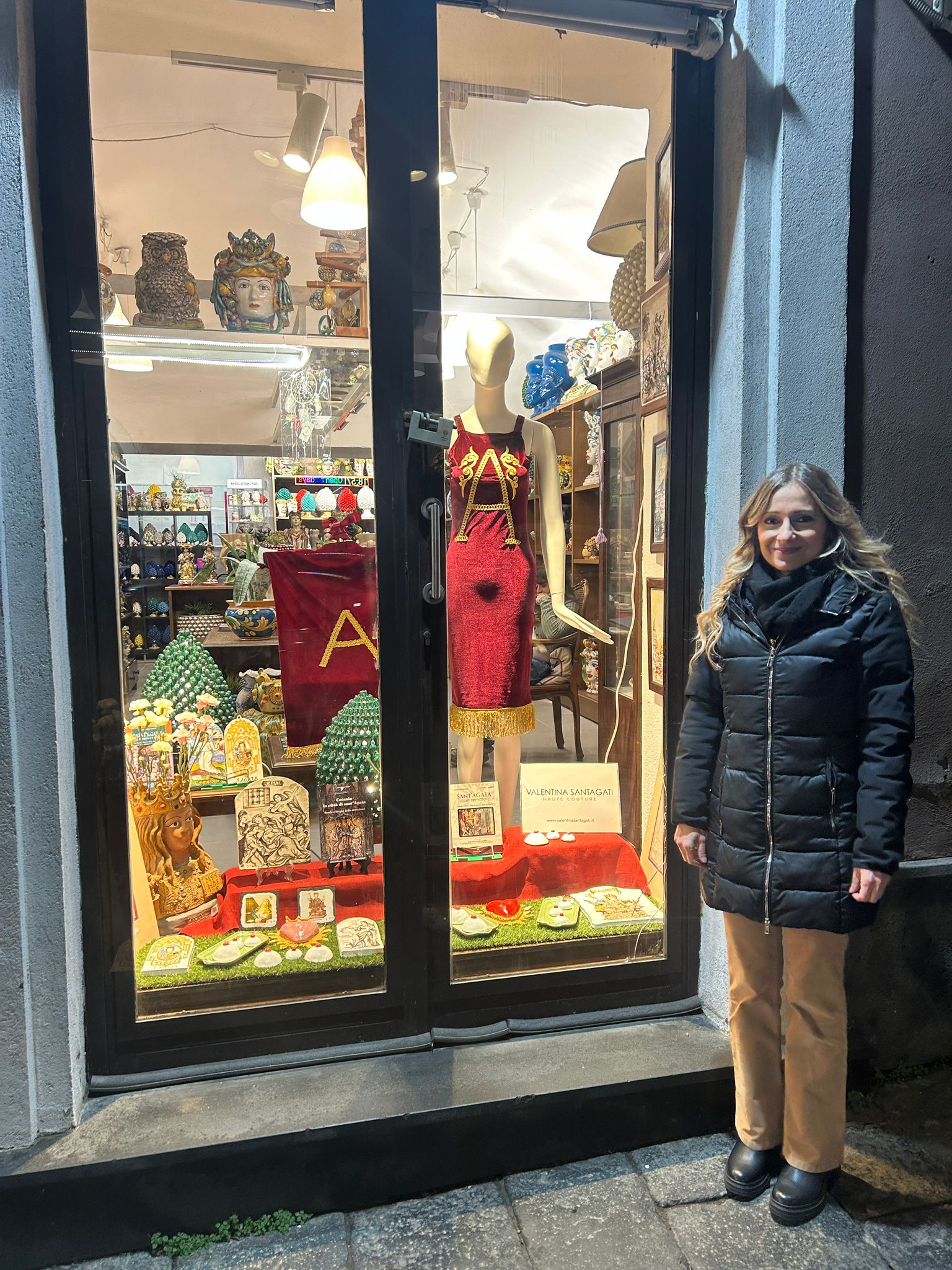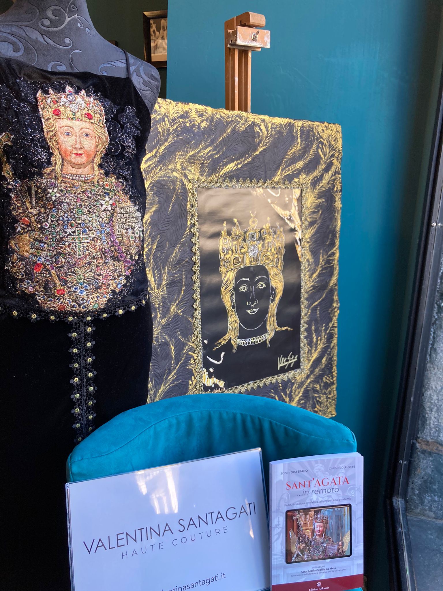 Questa iniziativa nasce come gesto di devozione e di fede personale: un’offerta silenziosa che, attraverso l’arte, intende rendere omaggio a Sant’Agata e condividere un sentimento profondo di appartenenza e gratitudine. Il primo allestimento, realizzato presso la vetrina di Catania Libri, presenta un abito in velluto bordeaux caratterizzato al centro dalla lettera “A”, chiaro richiamo al nome di Agata ed elemento tipico del segno devozionale catanese. L’abito è adornato da passamanerie, applicazioni e frange dorate ispirate allo stile barocco siciliano. Il secondo allestimento, ospitato presso l’Hotel Santuzza lungo via Etnea, si caratterizza per il dialogo tra moda e pittura.