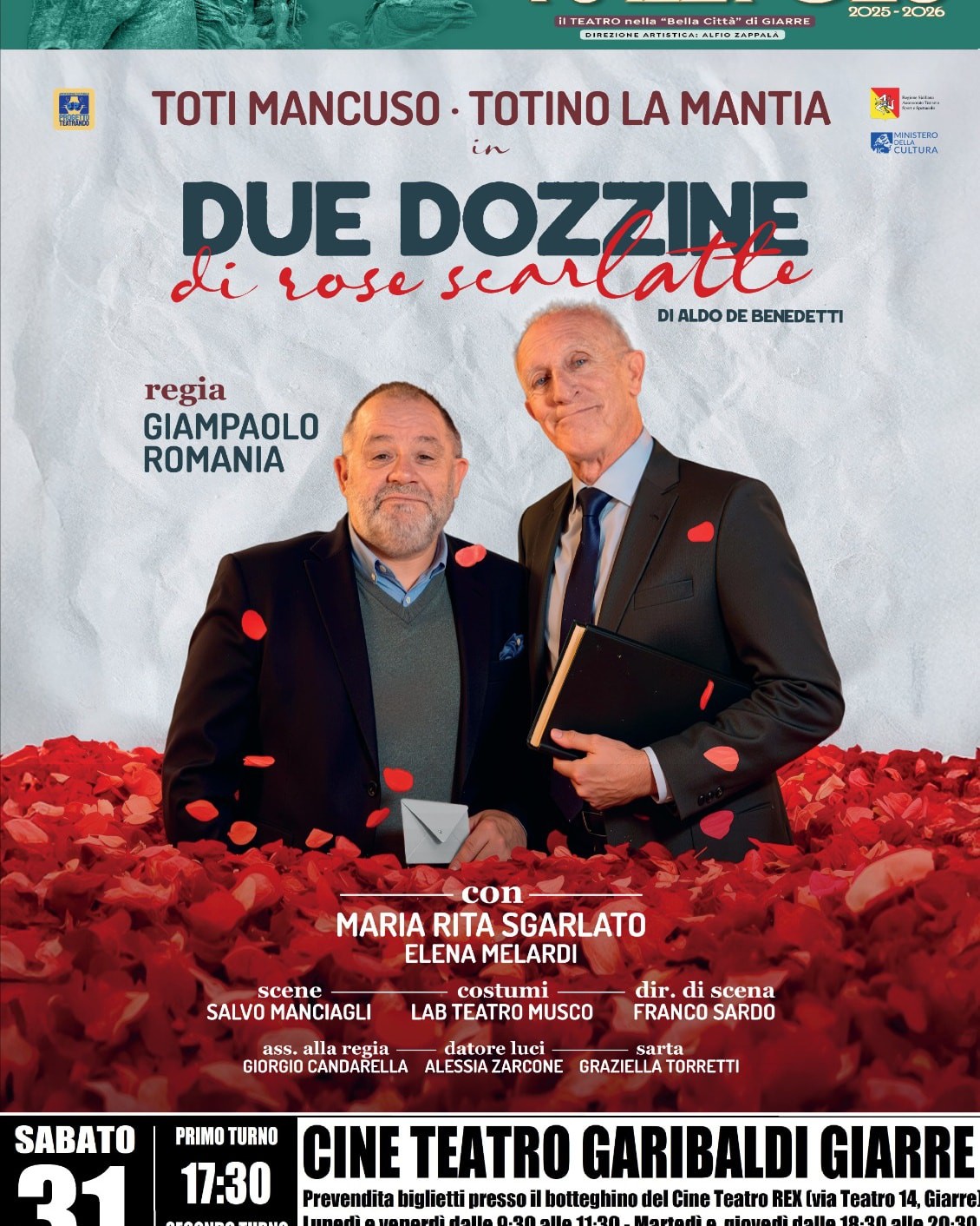Prosegue con successo la stagione teatrale “Kallipolis” diretta da Alfio Zappalà, organizzata da ArchiDrama, con il patrocinio del Comune di Giarre tra lo storico e rinnovato Cine Teatro Rex di Giarre e il Cine Teatro Garibaldi dove, sabato 31 gennaio (ore 17:30 – turno pomeridiano e ore 20:30 – turno serale), si terrà lo spettacolo “Due dozzine di rose scarlatte”.