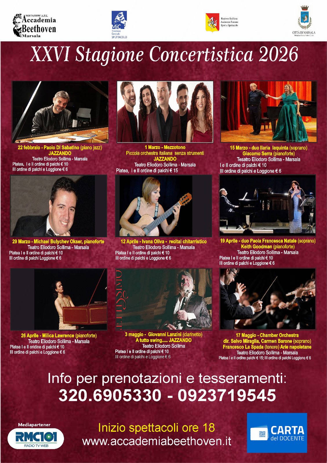 Il concerto inaugura una stagione particolarmente ricca con un cartellone di 18 eventi, divisi in due parti da nove spettacoli ciascuno, affiancati da otto incontri gratuiti. Si tratta di un nuovo percorso sociale denominato “Musica per tutti”, che amplia l’accessibilità culturale con attività inclusive rivolte a scuole, centri di accoglienza e realtà del territorio. L’iniziativa è realizzata con la compartecipazione del Comune di Marsala e gode del patrocinio del Ministero della Cultura e dell’Assessorato Regionale al Turismo, Sport e Spettacolo. Una delle principali novità della XXVI Stagione Concertistica è Jazzando, una vera e propria rassegna nella rassegna: un percorso interamente dedicato al mondo del jazz, articolato in sette appuntamenti musicali che esplorano le molte sfumature di questo affascinante genere.