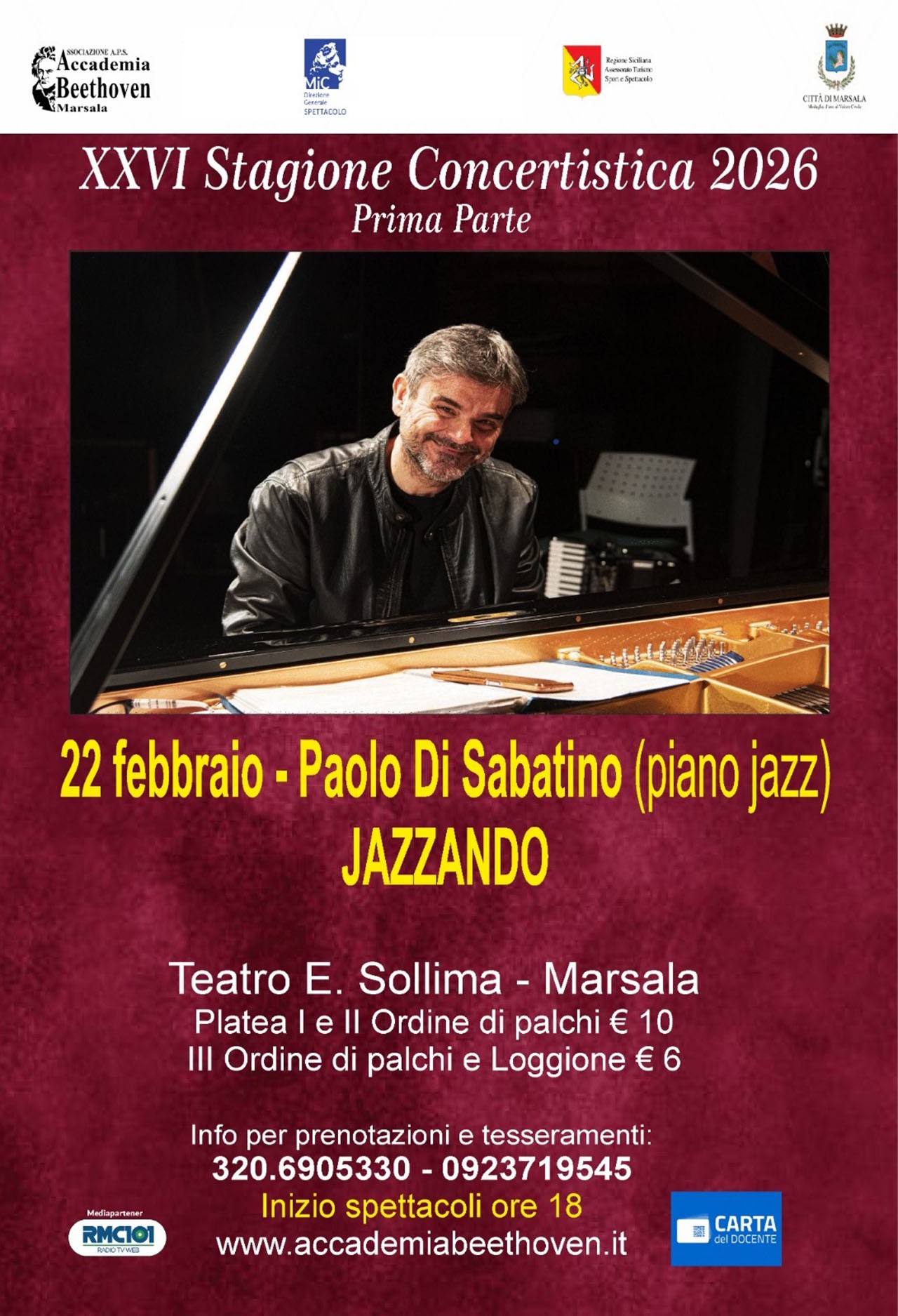 Il pianista e compositore Paolo Di Sabatino, figura di spicco del jazz italiano e internazionale, apre la XXVI Stagione Concertistica domenica 22 febbraio alle ore 18.00 sul palco del Teatro Comunale Eliodoro Sollima di Marsala. Il maestro Giuseppe Lo Cicero, presidente dell’Accademia Beethoven, per il primo spettacolo della rassegna Jazzando punta su un evento di prestigio assoluto: l’esibizione di un artista dal talento poliedrico. Di Sabatino ha calcato i palchi di tutto il mondo, da: Chicago a Tokyo, da Berlino a Buenos Aires, collaborando con musicisti del calibro di Fabrizio Bosso, Horacio “El Negro” Hernandez, Bob Mintzer e Randy Brecker. Pianista dal tocco inconfondibile e docente stimato, porta in concerto un universo sonoro che unisce lirismo mediterraneo, energia jazzistica e raffinatezza compositiva. La sua produzione discografica lo conferma tra i pianisti più creativi della scena contemporanea.