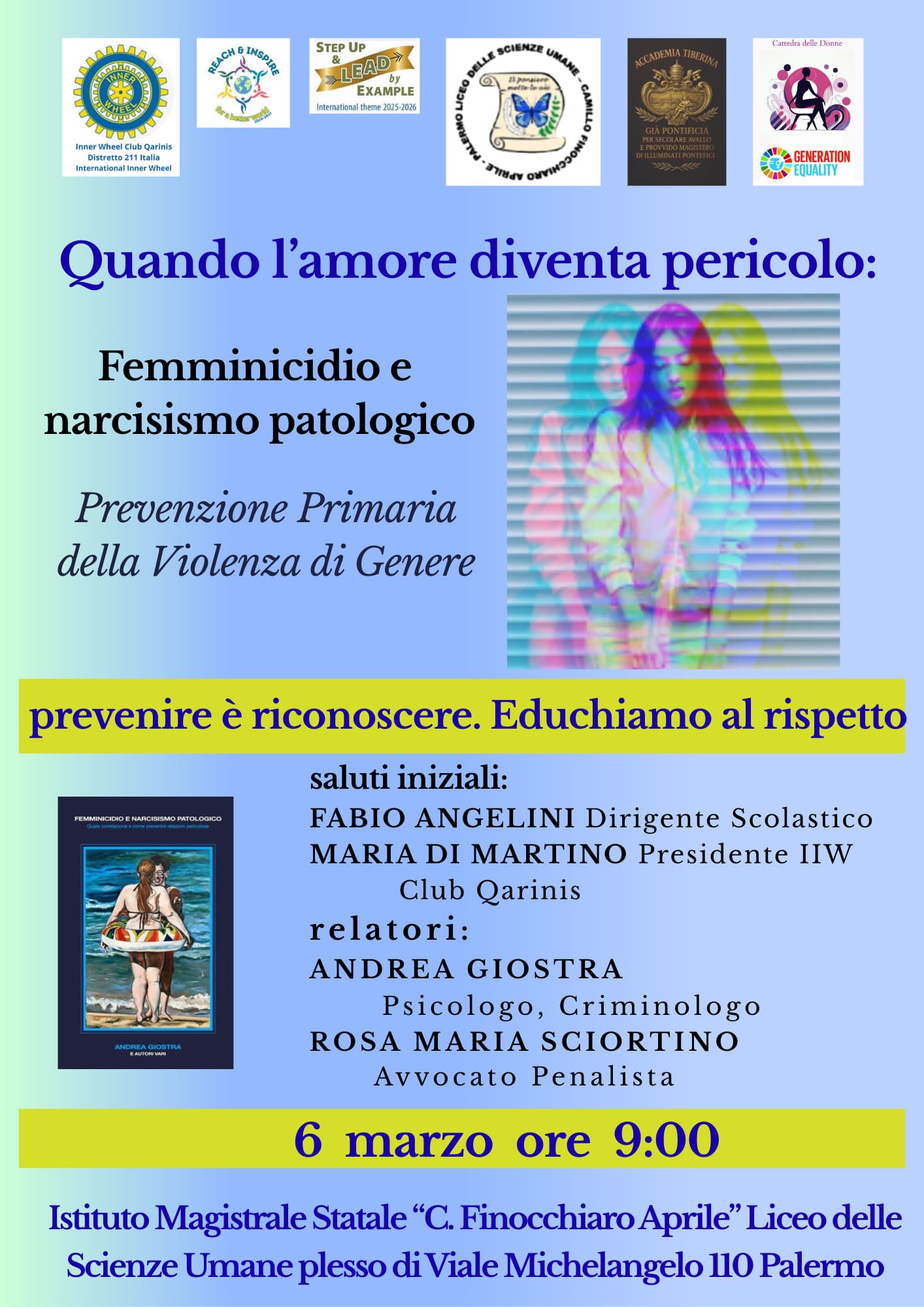 Questa nuova Conferenza organizzata presso il Liceo Finocchiaro Aprile, che si titola “Quando l’amore diventa pericolo: Femminicidio e narcisismo patologico”, è frutto del successo ottenuto dal precedente appuntamento del 5 dicembre 2025, promosso anche allora dalla Dirigenza scolastica insieme alla “Inner Wheel Club Qarinis-Distretto 211 Italia”, grazie anche alla sensibilità educativa e professionale della Prof.ssa Angela Monteverde. L’appuntamento del 6 marzo è esteso infatti alle studentesse della scuola che, non avendo potuto partecipare al primo incontro, hanno chiesto di organizzare un nuovo evento che trattasse tale delicato fenomeno sociale in sieme a esperti.