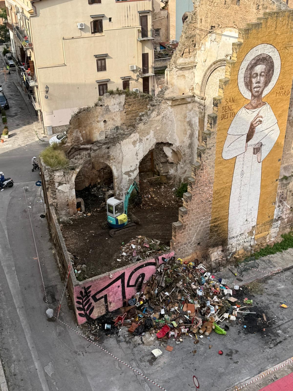Un luogo oggi ferito, nel cuore pulsante di Ballarò, che non può più essere lasciato all’incuria e all’abbandono. Ogni 19 marzo, in occasione della festa di San Giuseppe, i resti della chiesa diventano teatro delle cosiddette “vampe”: falò alimentati da rifiuti e legname accumulati tra le antiche mura. Un rituale che non solo deturpa un patrimonio storico e culturale, ma mette a serio rischio l’integrità delle strutture superstiti e della celebre opera iconica di Igor Scalisi Palminteri che domina la piazza.
