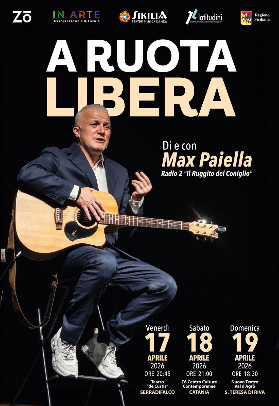 “A ruota libera”, uno degli appuntamenti più attesi della stagione, sarà rappresentato domenica 19 aprile, alle 18.30, nel Nuovo Teatro Val d’Agrò di Santa Teresa Riva (Messina). Un live entusiasmante, un flusso continuo di musica, ironia e improvvisazione, costruita momento con gli spettatori, per cui ogni spettacolo non è mai uguale a un altro.