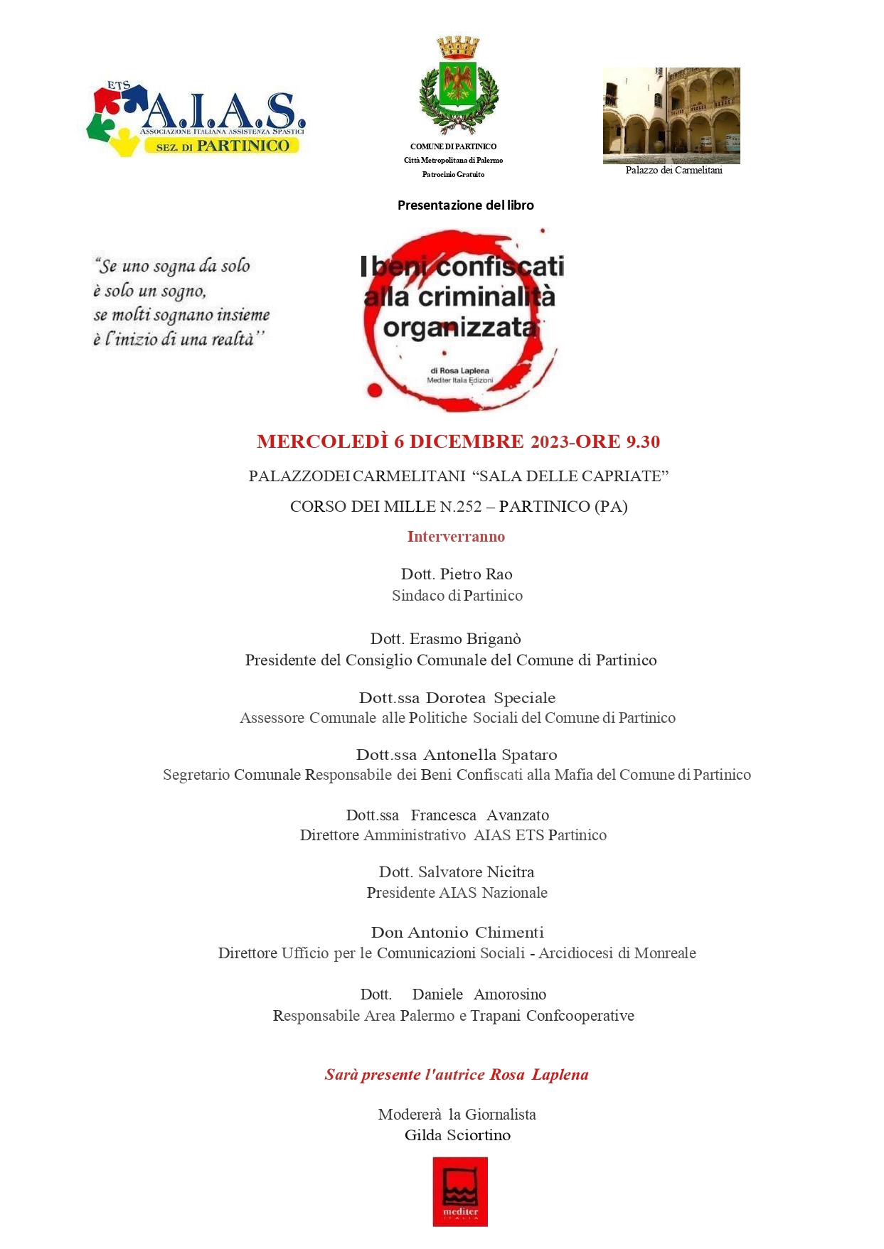 Ricco il parterre dei relatori: il sindaco di Partinico, Pietro Rao; il presidente del consiglio comunale di Partinico, Erasmo Briganò; l’assessore comunale alle Politiche Sociali, Dorotea Speciale; Antonella Spataro, segretario comunale responsabile dei Beni confiscati alla mafia; Salvatore Nicitra, presidente AIAS Nazionale; Francesca Avanzato, direttore amministrativo AIAS ETS Partinico; Don Antonio Chimenti, direttore dell’ufficio per le Comunicazioni Sociali – Arcidiocesi di Monreale; Daniele Amorosino, responsabile Area Palermo e Trapani Confcooperative.