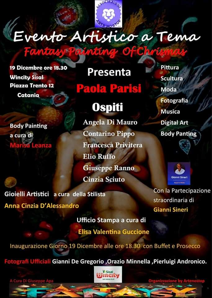 Catania- L’associazione culturale “Artenostop” del M° Giuseppe Apa tra arte, musica, moda e poesia martedì 19 dicembre, alle ore 18.30, negli eleganti spazi di Sisal Wincity diretto da Marilena Marino, brinderà al Natale con una speciale serata evento dal titolo “Fantasy Painting of Christmas”.