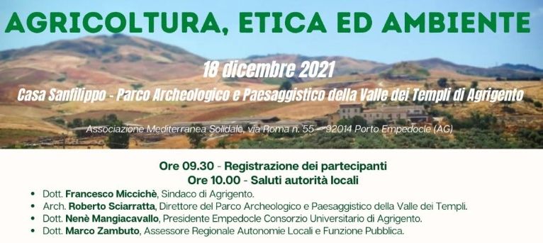 Agricoltura, etica e ambiente al centro del dibattito scientifico siciliano, sabato mattina 18 dicembre dalle 9.30, presso Casa Sanfilippo, all’interno del Parco Archeologico e paesaggistico della Valle dei Templi di Agrigento.
