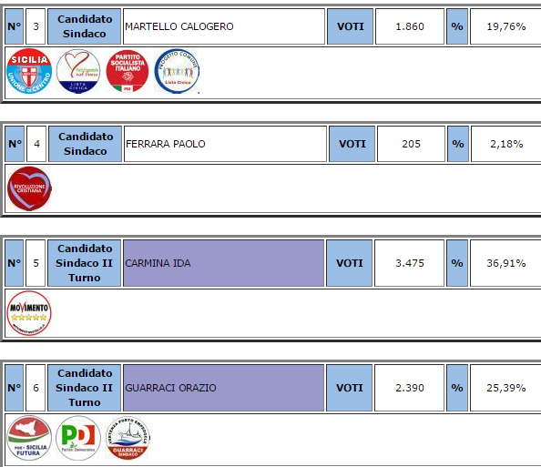 Sarà ballottaggio fra il candidato 5 stelle in netto vantaggio ed il candidato appoggiato dal Pd a Porto Empedocle in provincia di Agrigento. La pentastellata Ida Carmina con 3475 voti raggiunge il 36,91% ma non il 50% più uno necessario per essere eletta al primo turno.