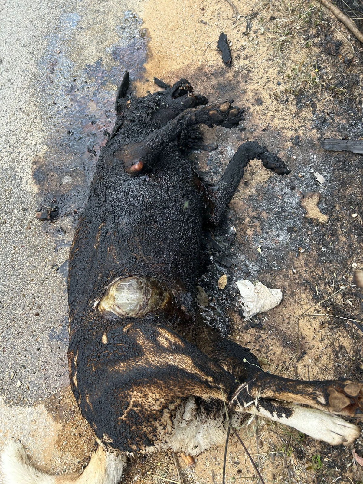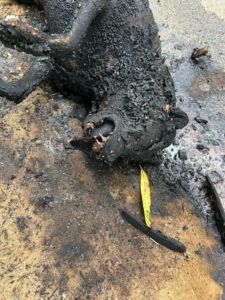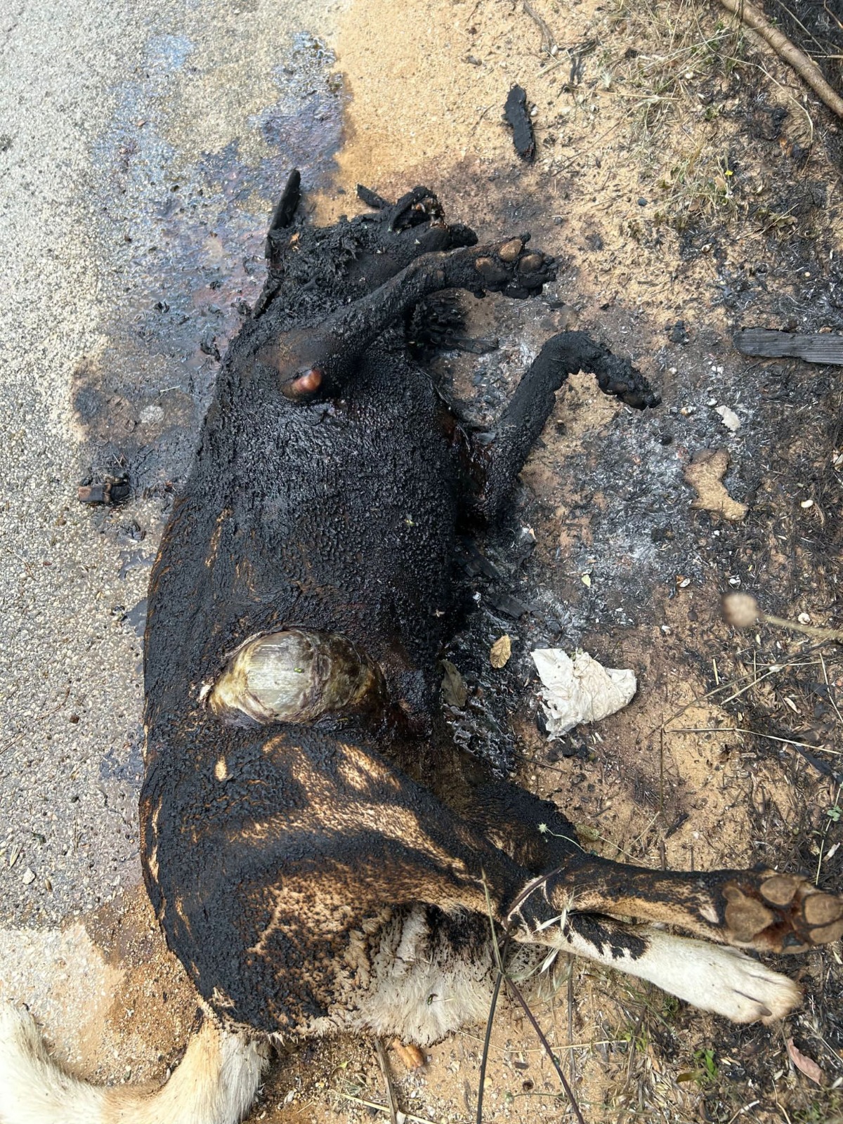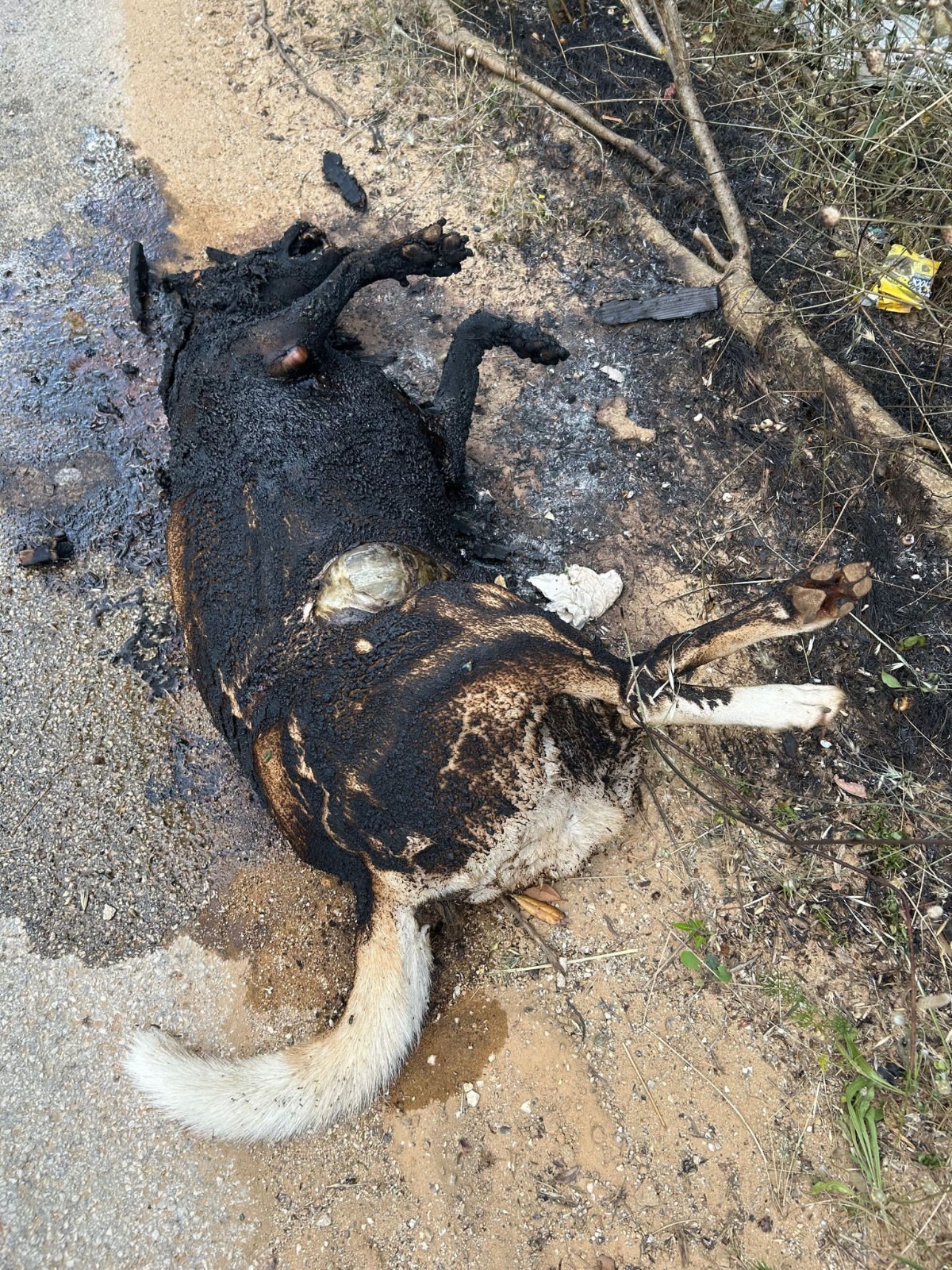 La dinamica al momento non è chiara e si attende l’intervento delle Forze dell’Ordine per i rilievi. Purtroppo il timore (ripetiamo, è una ipotesi) è che il cane, ancora in vita, sia stato prima bloccato legandolo per i piedi, poi cosparso di liquido infiammabile e successivamente dato alle fiamme. Domani mattina l’associazione depositerà una denuncia contro ignoti.