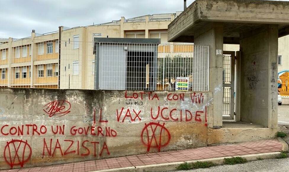 Scritte con bomboletta spray di colore rosso con messaggi quali “Il vaccino uccide”, “Lotta con vivi – 3 k morti per Covid – Il Governo mente”, “Il vax uccide”, “Contro un Governo nazista”.
