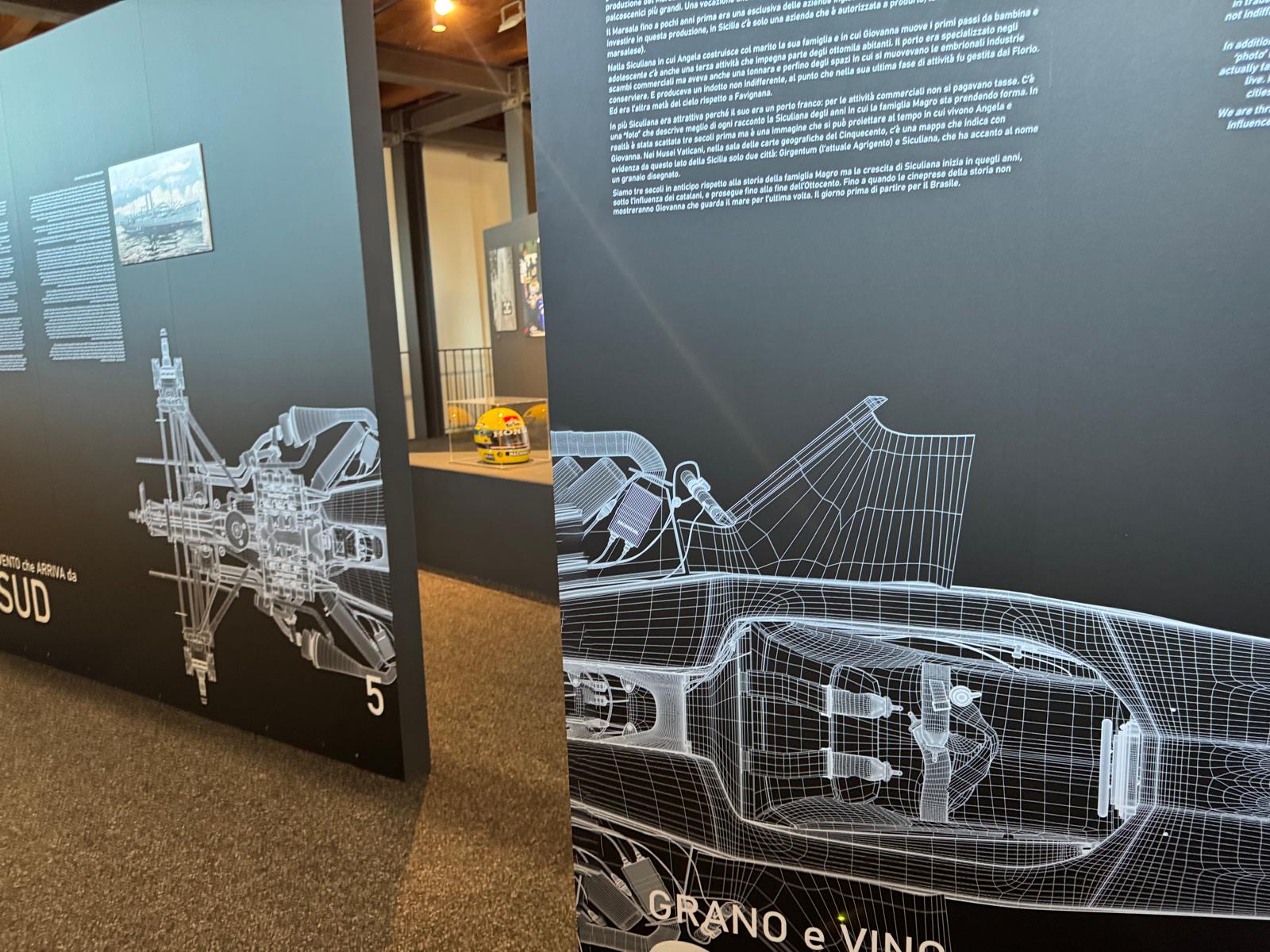“La progettazione dell’allestimento – spiegano Ferla e Nigrelli – è ispirata al dialogo tra storia e tecnologia. Le origini siciliane del ramo materno di Ayrton, e la tecnologia avanzata delle autovetture che lui amava immensamente. Le componenti delle origini, documentali, il viaggio, si fondono con schemi hitech delle monoposto, graficizzate come organismi vivi, aperte come tavole anatomiche, dalle quali si possono cogliere parti di telaio, di motore, sospensioni… con un approccio pittorico all’illuminazione, trasformando la meccanica in opere illuminate in ispirazione barocca. L’allestimento è caratterizzato da una integrazione già in fase progettuale con le nuove tecnologie di fruizione digitale, virtual reality, mixed ed augmented reality, con la progettazione di slot predisposti per il fruitore seduto che può indossare tipologie diverse di visori e visualizzare parti delle monoposto o fruire di viste interattive del territorio. La sperimentazione ha riguardato soprattutto le tecniche di fine art, con realizzazione di stampe a filigrana, incisioni laser, metalli e supporti tecnici”.