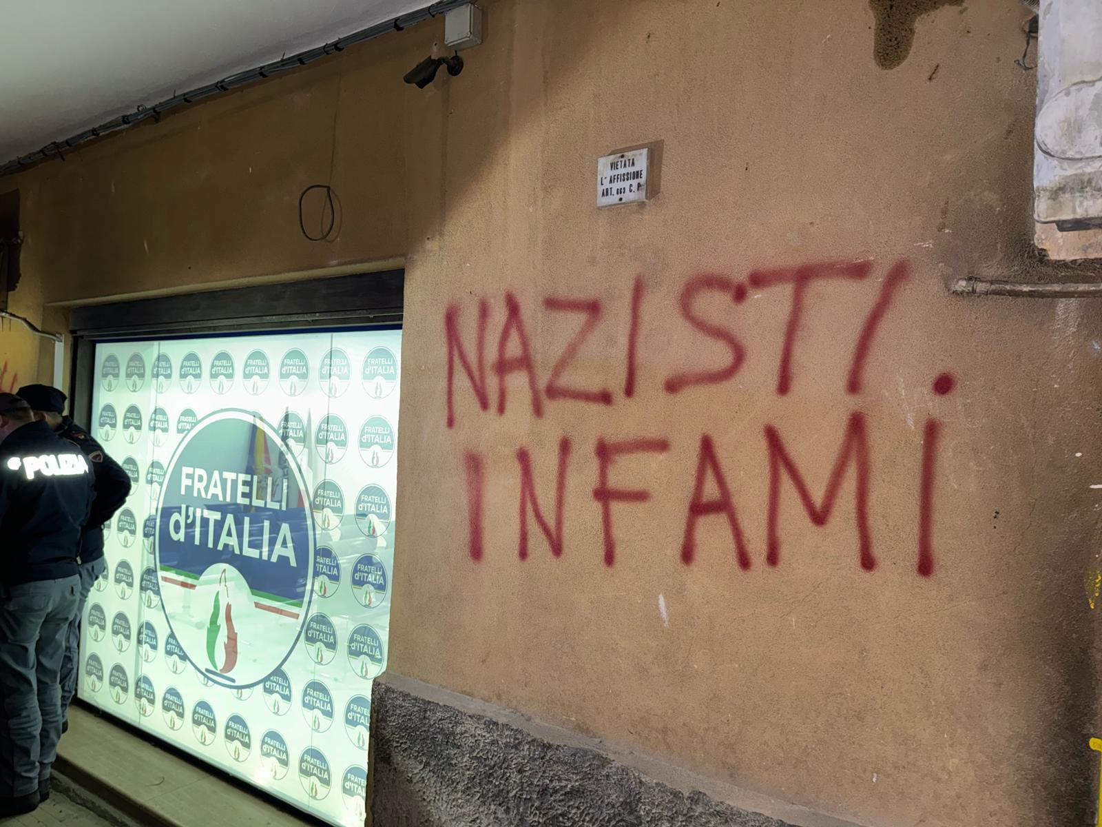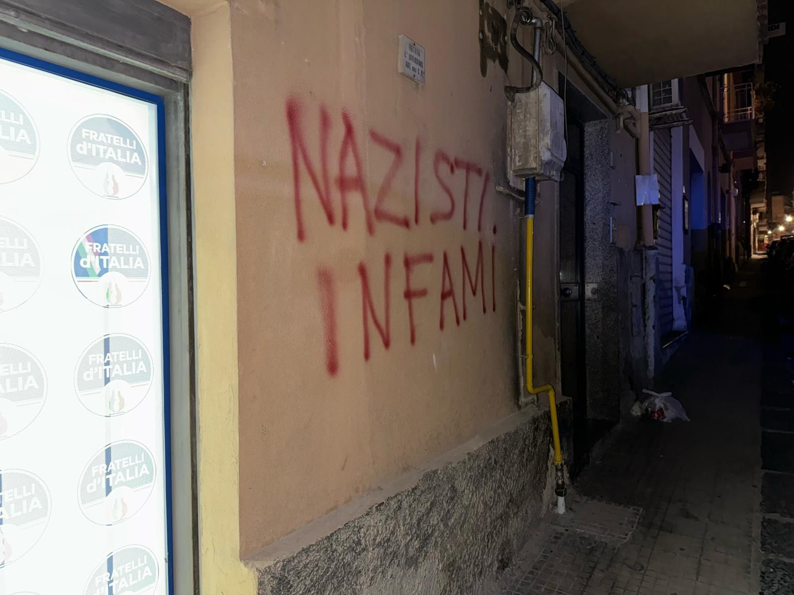 “Nazisti infami”. E’ la scritta comparsa sui muri perimetrali della sede di Fratelli d’Italia al centro di Agrigento. Il danneggiamento considerato intimidatorio è stato portato a termine nel fine settimana in via Gioeni accanto all’ingresso dei locali che sono anche sede della segreteria politica di Giusi Savarino, avvocato e deputato regionale alla quarta legislatura e componente delle Commissioni Affari Istituzionali e Cultura.