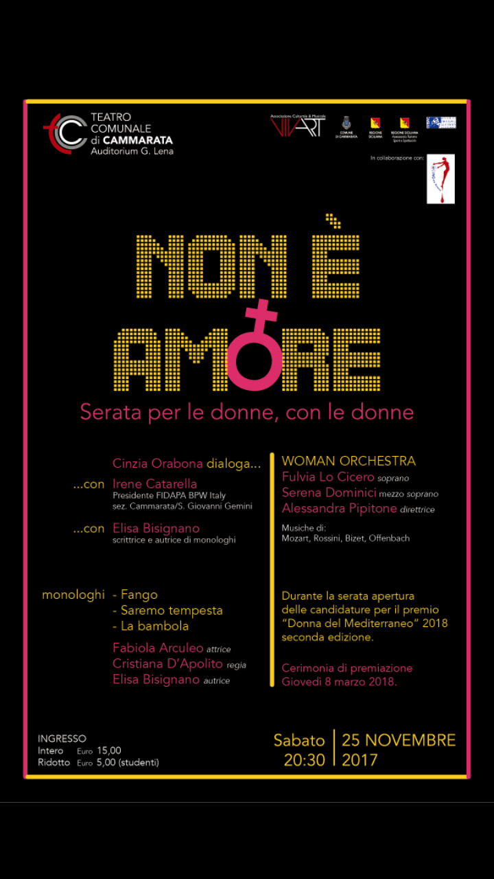 Il 25 novembre 2017 alle ore 20:30, in occasione della Giornata Internazionale contro la Violenza sulle Donne, il Teatro Comunale G. Lena di Cammarata (AG) propone il primo dei due eventi in calendario dedicati alle donne.(il prossimo l’8 marzo 2018)
