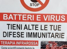 I carabinieri del Nas hanno sequestro uno studio di fisioterapia di una ditta individuale di Palermo, che con i volantini pubblicizzava "Stop A batteri e virus" con il trattamento di fototerapia con luce infrarossa.