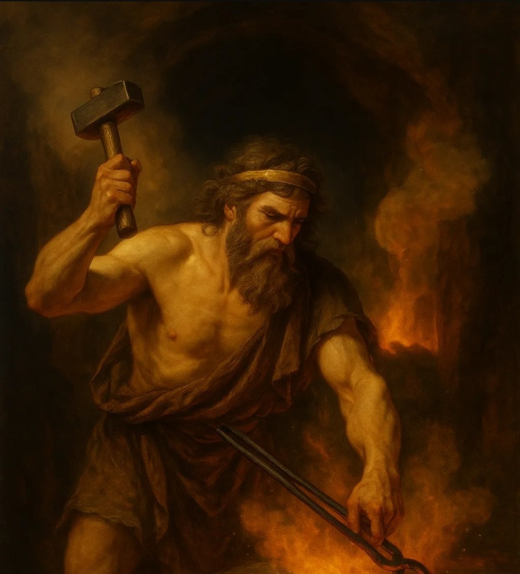 L’arte antica lo ha raffigurato barbuto, possente e vestito di una corta tunica da lavoro: in altre parole Russel Crowe ne “Il gladiatore” o il nostro Francesco Pannoffino. Chiamatemi pure “efestina”, ma sono sicura che a me sarebbe piaciuto, forse perché detesto i mister Olimpo. La madre degenere, ovvero Era, ai giorni nostri, metto la mano sul fuoco, lo avrebbe costretto, quasi certamente, a sottoporsi alla chirurgia estetica, non capendo di essere lei ad aver bisogno di una bella chirurgia “etica”.