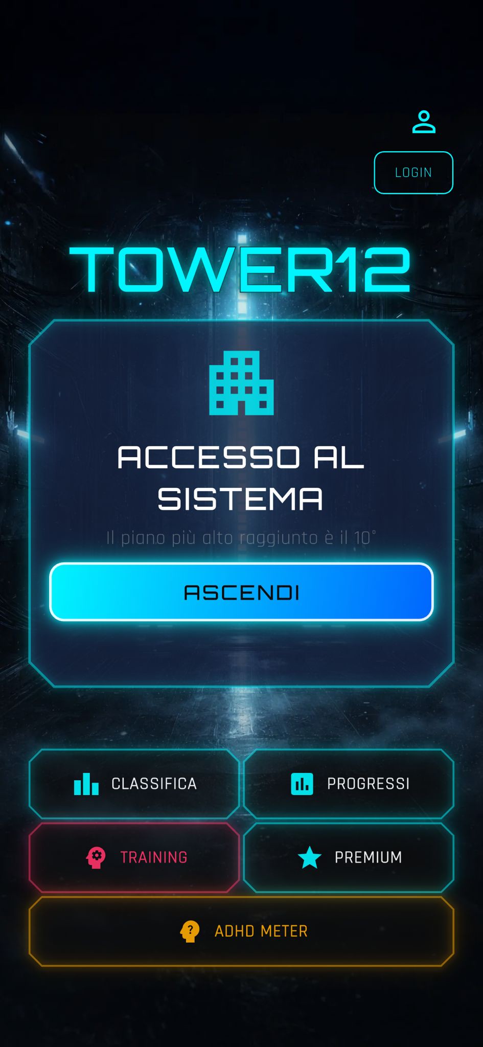 L’app è disponibile su Android e iOS e si sviluppa attorno a una struttura che abbiamo voluto rendere immediata: una torre di 12 piani, in cui ogni livello corrisponde a una sfida cognitiva diversa. Nelle pagine ufficiali, Tower12 viene presentata come una piattaforma con quiz cognitivi, classifiche in tempo reale e ADHD Meter.