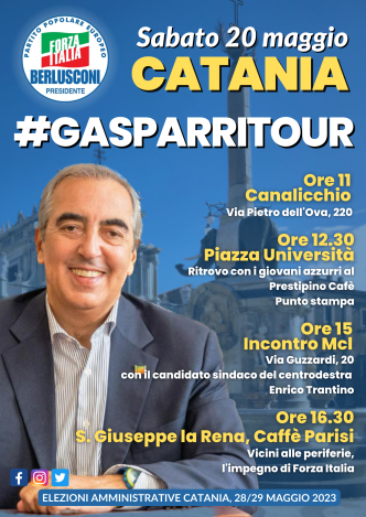 Il vicepresidente del Senato Maurizio Gasparri, responsabile nazionale Enti locali FI, sarà in tour a Catania sabato 20 maggio assieme ai candidati di Forza Italia alle Amministrative etnee del prossimo 28 e 29 maggio. Ad accompagnarlo l’assessore regionale Marco Falcone, commissario FI per Catania e provincia.