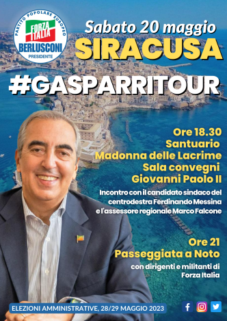 In serata il vicepresidente Gasparri raggiungerà Siracusa per un’iniziativa a sostegno del candidato sindaco del centrodestra Ferdinando Messina, nella sala convegni del Santuario Madonna delle Lacrime (ore 18.30). Presenti l’assessore Marco Falcone e il deputato regionale FI Riccardo Gennuso. Alle ore 21, passeggiata nella città di Noto.