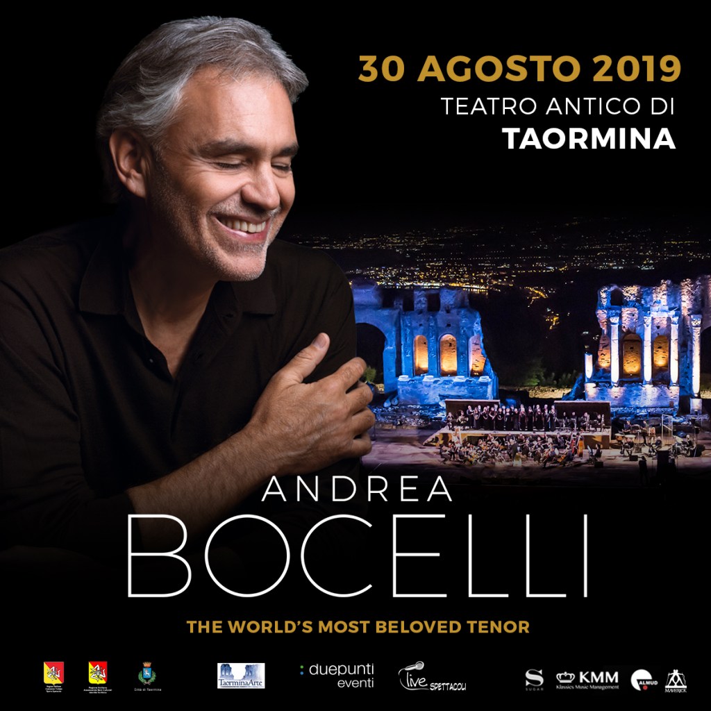 Il concerto di Andrea Bocelli al Teatro antico di Taormina, uno dei teatri più affascinanti al mondo, è promosso da Fondazione Taormina Arte Sicilia e organizzato da Due Punti Eventi, società leader in Italia nell’organizzazione e gestione degli spettacoli dal vivo, in collaborazione con Live Spettacoli e Parco Archeologico di Naxos e con il patrocinio dell’Assessorato Beni Culturali Identità Siciliana e dell’Assessorato Turismo, Sport e Spettacolo della Regione Sicilia e della Città di Taormina.
