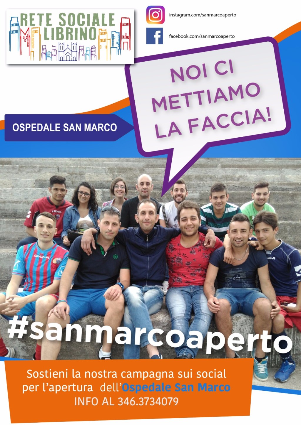 Con l’hastag #sanmarcoaperto, hanno cominciato a girare in rete, su Facebook, Twitter e Instagram (www.facebook.com/sanmarcoaperto, www.instagram.com/sanmarcoaperto), fotografie in cui uomini e donne abitanti a Librino e nei quartieri limitrofi intendono sensibilizzare le istituzioni affinchè la zona sud di Catania, che conta almeno 80.000 abitanti, sia finalmente dotata dell’ospedale.