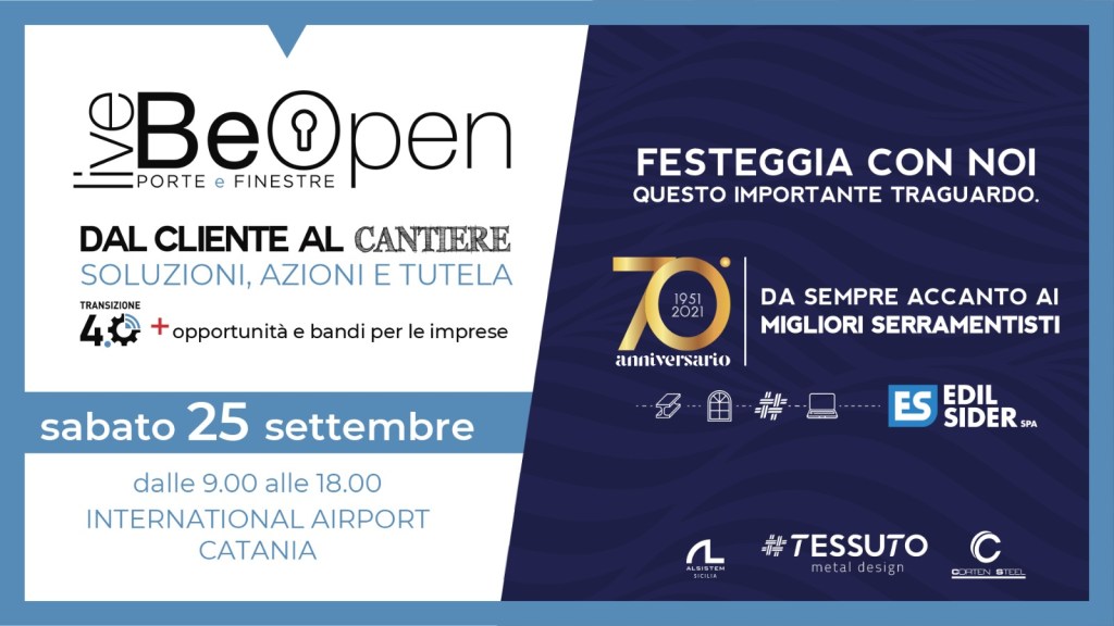 Riparte il settore degli eventi e fa tappa in Sicilia il BeOpen, l’evento italiano più importante per il settore del serramento, organizzato da LEGNOLEGNO – Consorzio Nazionale dei Serramentisti in collaborazione con Edil Sider Spa, main sponsor della tappa siciliana che festeggerà i suoi 70 anni di attività.