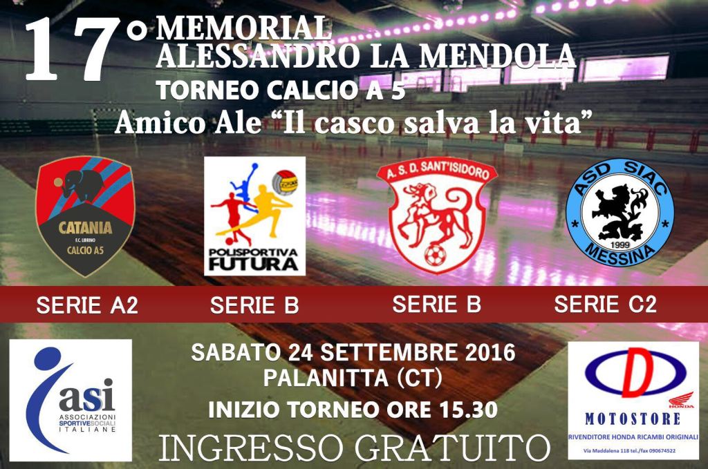 Voglia di scendere in campo, di capire a che punto è la preparazione e nello stesso tempo scommettersi per una causa importante. Sabato 24 settembre a partire dalle 15.30 al Palanitta di Catania si terrà l’edizione numero 17 del “Memorial Alessandro La Mendola – Amico Ale, il casco salva la vita”; quadrangolare di Calcio a 5 in memoria del giovane messinese scomparso nel 1999 in un incidente stradale.