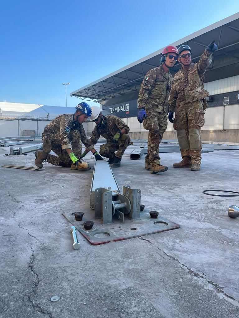 Relativamente alla situazione del Terminal C, sono pienamente operative le strutture montate dall’Aeronautica Militare in airside, che hanno consentito di ampliare l’area per gli imbarchi, agevolando così le operazioni. Proseguono inoltre, a pieno ritmo, le operazioni di montaggio della quarta tensostruttura da parte del personale logistico dell’Aeronautica Militare in linea con quanto disposto dal Ministro della Difesa Guido Crosetto. La nuova struttura permetterà, una volta ultimata, l’allestimento di un vero e proprio terminal aggiuntivo. Domenica è previsto l’arrivo dei radiogeni che permetteranno di allestire desk check in e controlli. Il “piccolo terminal”, che dovrebbe essere completamente operativo già martedì, consentirà di arrivare fino a 14 voli ogni ora, 7 in arrivo e 7 in partenza.