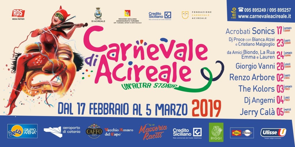 “Siamo molto orgogliosi di annunciare quest’anno il nostro legame con il Carnevale di Acireale – sottolinea Daniele Cipollina amministratore di Adv Maiora – attraverso la partecipazione di importanti sponsor Nazionali : Distillerie F.lli Caffo – Amaro del Capo; Diesse Monouso – Bibo; Molini Riggi; Credito Siciliano; Ulisse, Gruppo Arena; Aeroporto di Catania e Masseria Raciti.