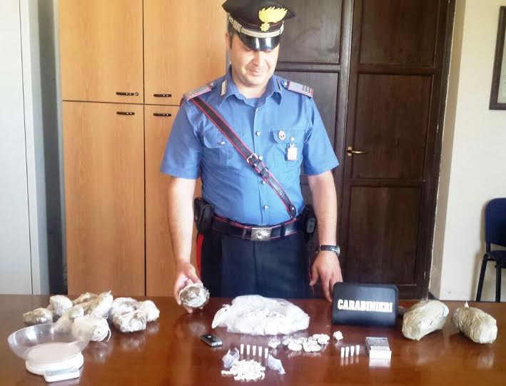 Un chilo di marijuana di cui una parte suddivisa in dosi, 16 grammi di cocaina e 12 grammi di eroina e il materiale utilizzato per il confezionamento dello stupefacente.