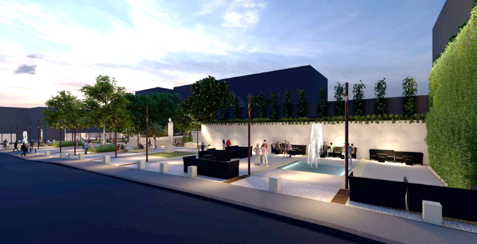 La superficie totale dell’area interessata dai lavori per la nuova piazza è di 4.150 metri quadrati, 1.250 dei quali saranno destinati a verde. Il progetto prevede la realizzazione di due vasche con giochi d’acqua alternate da alberature di carrubo, saranno posizionati anche due gruppi scultorei già presenti nell’ex area ospedaliera.