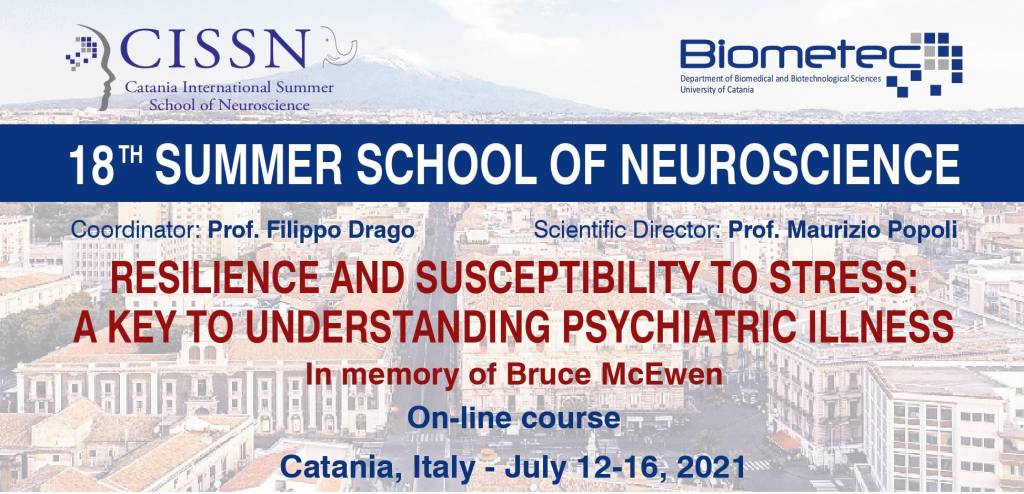 “Resilienza e suscettibilità allo stress: la chiave per comprendere le malattie psichiatriche”. Sarà questo il tema della Catania International Summer School of Neuroscience 2021 promossa dal professore Filippo Drago del dipartimento di Scienze Biomediche e Biotecnologiche dell’Università di Catania che si terrà dal 12 al 16 luglio in modalità on-line con la direzione scientifica del professore Maurizio Popoli, farmacologo dell’Università di Milano.