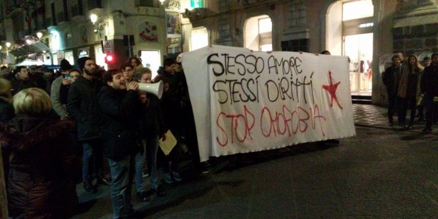 I militanti hanno distribuito volantini e aperto uno uno striscione con scritto “Stesso amore, stessi diritti! Stop omofobia” e poi sono uniti alla manifestazione del movimento LGBT in piazza Stesicoro.