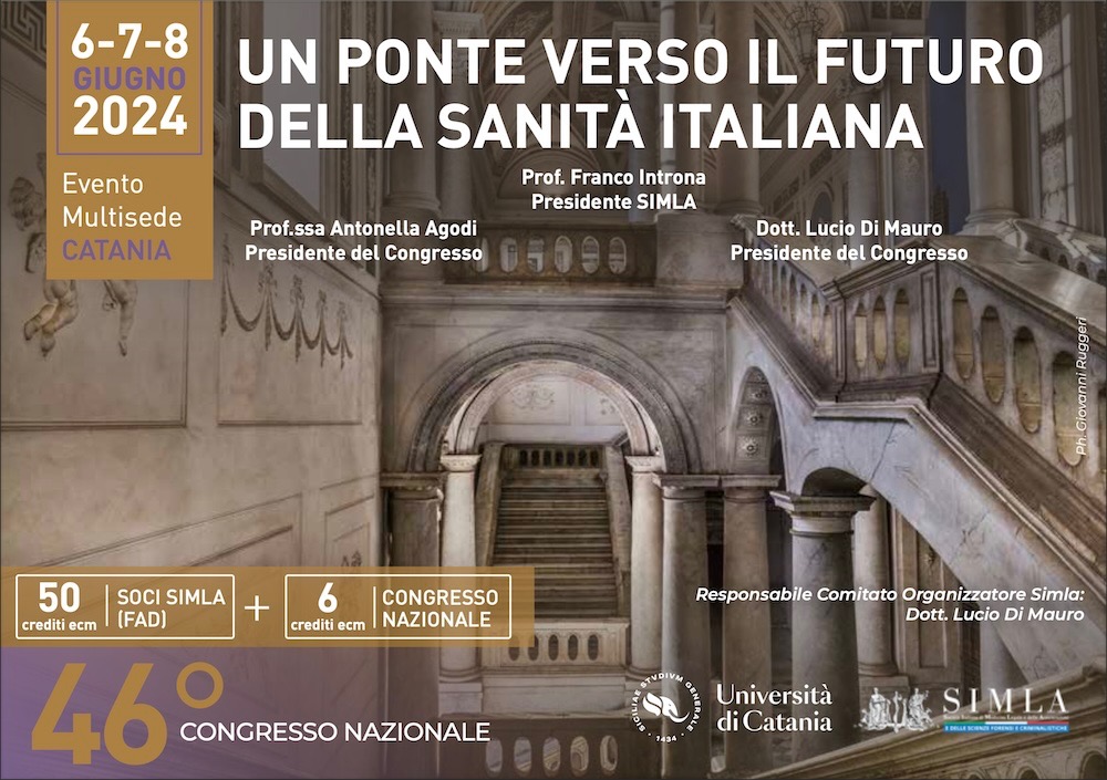 “C’è l’idea di voler lanciare un messaggio chiaro alla comunità scientifica: dall’estremo sud del territorio nazionale vogliamo articolare un segnale di unità della disciplina medico legale nazionale in questo virtuoso assetto associativo che vede l’intima connessione tra l’Accademia e le diverse anime della professione medico legale”. Lo precisano il professore Francesco Introna, presidente SIMLA e ordinario di Medicina Legale all’Università “Aldo Moro” di Bari, e il dott. Lucio Di Mauro, medico legale, segretario nazionale SIMLA e presidente del Congresso, annunciando l’apertura del 46° Congresso nazionale della Società Scientifica a Catania, che comincerà, il prossimo 6 giugno alle 9.00, nello scenario tardo barocco del Monastero dei Benedettini di S. Nicolò L’Arena (Piazza Dante Alighieri, 32), tra l’aula Santo Mazzarino, il coro di notte e l’auditorium De Carlo, e proseguirà, tra il 7 e l’8 giugno, al Four Points by Sheraton Catania Hotel (via Antonello Da Messina 45, Aci Castello). Un evento di rilevanza internazionale che si tiene per la prima volta nel centro etneo con la collaborazione dell’autorevole e riconosciuta Cattedra di Medicina Legale dell’Università degli Studi di Catania, che vede quest’ultima come ente patrocinante dell’evento.