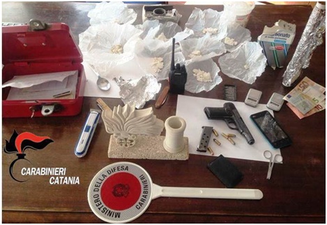 Nella loro abitazione nel rione San Giorgio, militari dell’Arma hanno trovato una pistola Browning cal. 7,65, completa di caricatore contenente 6 cartucce, risultata rubata a Siracusa il 27 dicembre del 2015, cento grammi di cocaina, ancora da tagliare e dosare, due bilancini elettronici di precisione e materiale confezionare ‘dosi’ di stupefacenti.