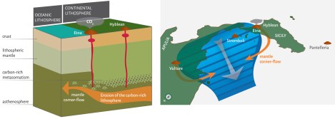 Tale rapporto rivela la presenza di porzioni di mantello arricchite in carbonio a circa 50 km di profondità al di sotto dell’Italia meridionale. Il particolare assetto e la geodinamica delle placche in questa regione favoriscono il rilascio e la risalita di anidride carbonica nei due vulcani.