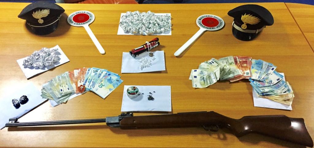 Aveva con sè 111 grammi di marijuana e sei grammi di cocaina, già suddivise in dosi e la somma contante di 1.651 euro in banconote di piccolo taglio, ritenute provento dell’attività di spaccio. Inoltre nel bagagliaio dell’auto i carabinieri hanno trovato anche una carabina ad aria compressa.