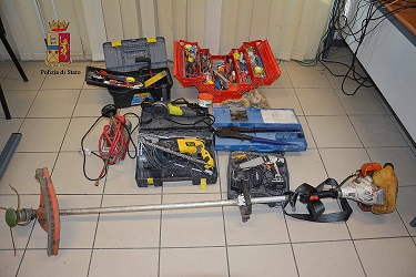 Inoltre, nel bagagliaio l’uomo trasportava un decespugliatore marca “Valgarden”, una valigetta professionale contente materiale per installazione di climatizzatori, un trapano avvitatore, un trapano “tassellatore”, una pompa per ricarica climatizzatori, una cassetta completa di attrezzi, una cassetta completa di attrezzi marca “USAG” ed un flex.