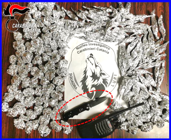 La perquisizione del borsello del ragazzo ha consentito il sequestro di ben 102 dosi di marijuana, 58 dosi di marijuana della varietà “Orange Shunk” ed una radiotrasmittente. Il 22enne è stato trasportato al carcere di Catania Piazza Lanza, come disposto dal giudice in sede di udienza per direttissima.
