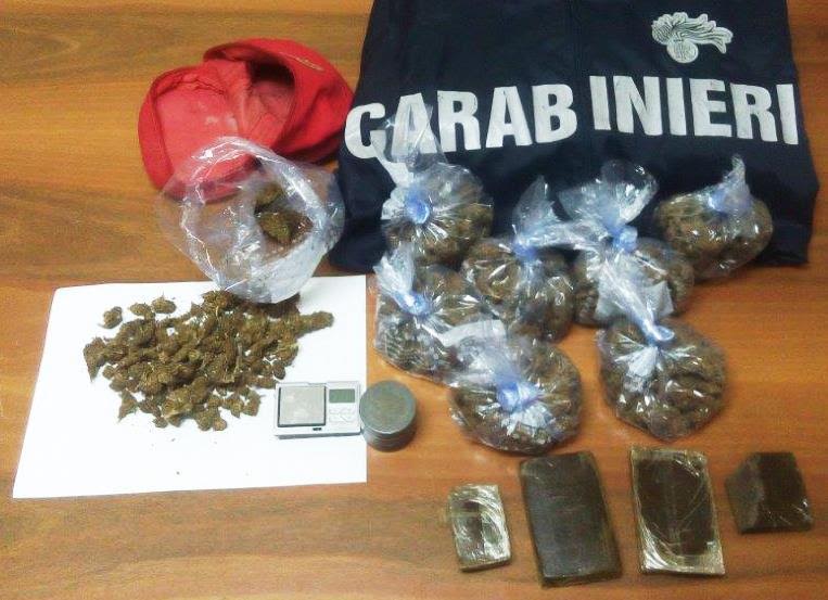 In auto aveva un bilancino di precisione otto buste in cellophane contenenti complessivamente 400 grammi di marijuana e 4 panetti di hashish per un peso totale di circa 300 grammi del valore al dettaglio di circa 10.000 euro.
