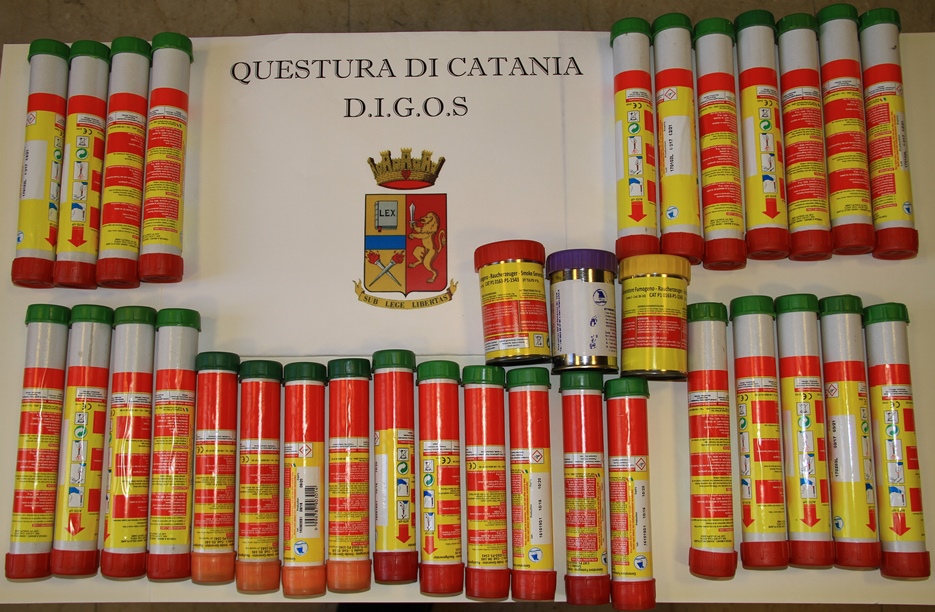 Agenti della Digos della questiura di Catania hanno sequestrato, lo scorso 15 aprile, 31 torce fumogene da stadio e tre barattoli fumogeni nel corso di diverse perquisizioni nelle abitazioni di due noti militanti antagonisti etnei.