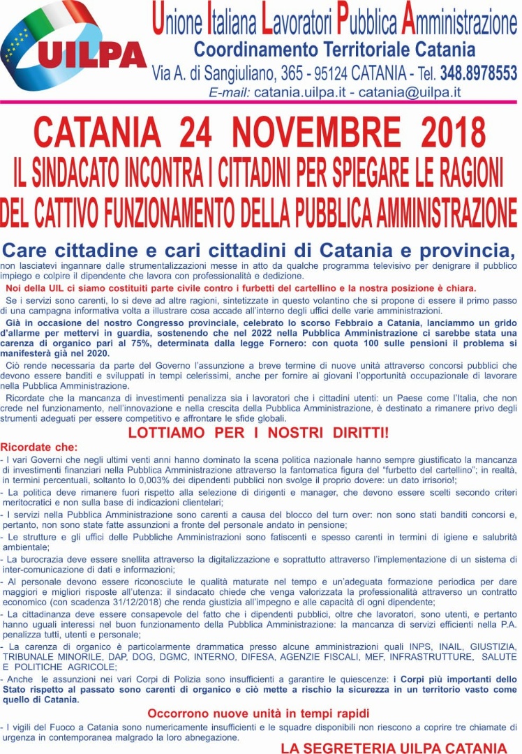 È questo il senso dell’azione di sensibilizzazione che la Uil Pubblica Amministrazione terrà domani 24 novembre a Catania dove, tra piazza Stesicoro e via Etnea, dalle 10:30 alle 12:30, il sindacato distribuirà materiale informativo e incontrerà i cittadini : a darne notizia è il segretario generale Armando Algozzino, che spiega le motivazioni dell’iniziativa, puntando il dito contro gli eccessi della burocrazia e la disattenzione generale da parte della politica.