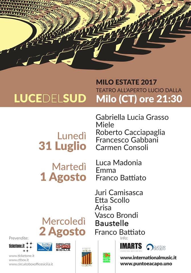 Gran finale domani con Arisa, Etta Scollo, Juri Camisasca, Vasco Brondi e, ospiti speciali, i Baustelle e ancora Battiato, autentico “deus ex machina” di Luce del Sud, rassegna che conferma il ruolo di Milo, già conosciuta dagli enogastronauti per la ricca produzione di Etna Bianco Superiore doc, come uno dei poli della musica live nell’estate siciliana.