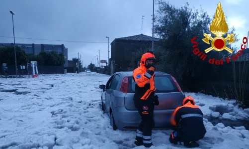 Una fitta grandinata si è abbattuta nel Catanese: colpiti, come segnalato dai vigili del fuoco, alcuni paesi etnei del versante Sud-Est. I pompieri sono stati impegnati in numerosi interventi di soccorso, in particolare nei comuni di San Giovanni la Punta, Trecastagni, Gravina di Catania sono stati soccorsi molti automobilisti bloccati nelle loro auto in panne. Oltre alle squadre della sede centrale del Comando e dei Distaccamenti Nord e Sud, al lavori ci sono anche i sommozzatori dei Nucleo di Catania e le squadre dei distaccamenti di Acireale e Riposto.