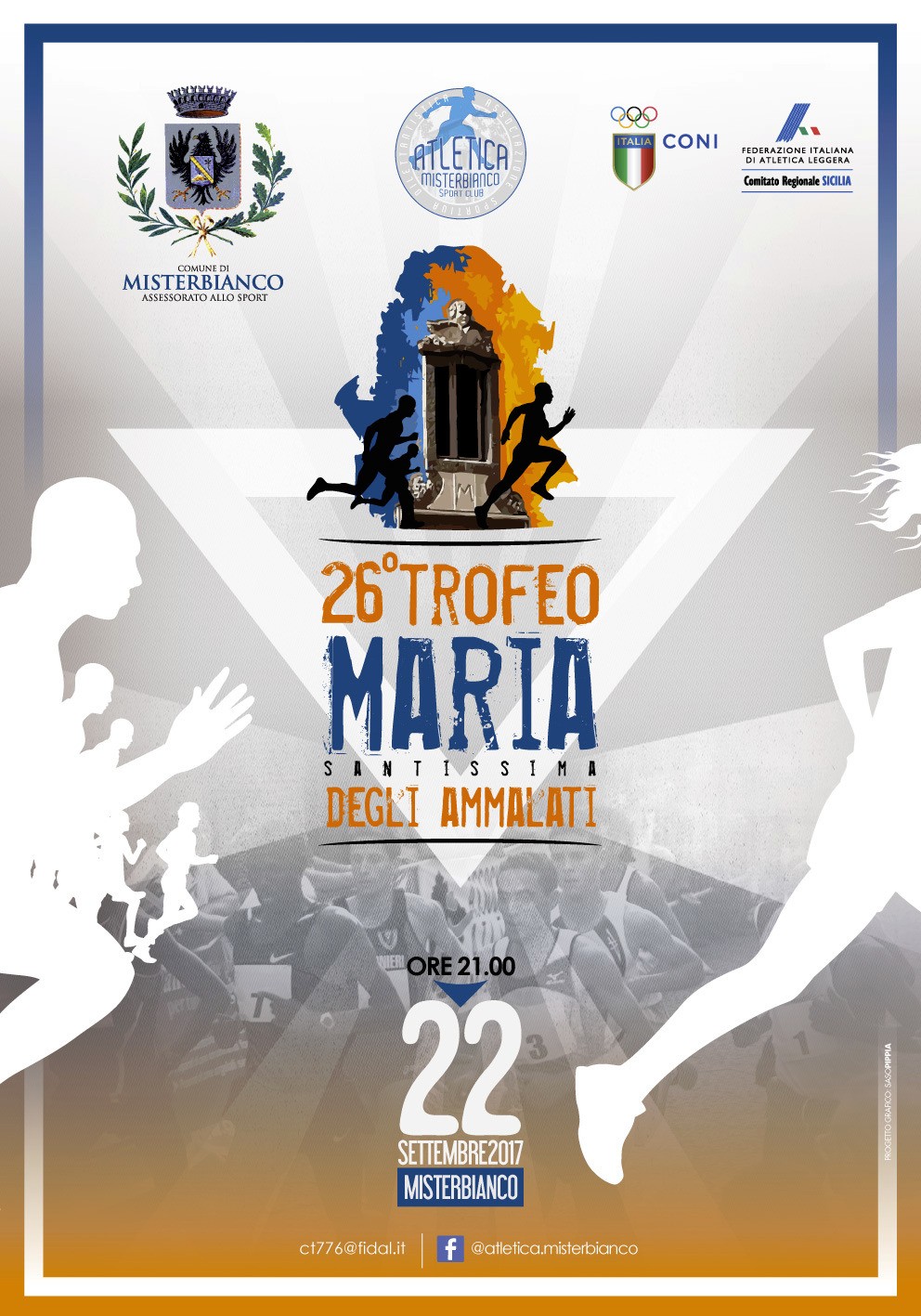 Sarà uno start denso di emozioni quello che darà il via venerdì 22 settembre, al trofeo “Maria SS. degli Ammalati” che celebrerà la sua 26esima edizione. Un ritorno, dopo un’assenza di sette anni , carico di prospettive, una riproposizione della storica manifestazione nata e cresciuta grazie a Santo Spina e a Santo Baudo, rispettivamente presidente e vice presidente dell’ASD Atletica Misterbianco; un test con l’obiettivo di riallacciare passato e presente, all’insegna della continuità e della tradizione, così come ha sottolineato Antonio Belfiore presidente dell’ ASD Atletica Misterbianco Sport Club che ha avuto l’onere e l’onore di rimettere in pista la storica manifestazione con al fianco i due organizzatori storici del Trofeo e l’Amministrazione Comunale di Misterbianco guidata dal sindaco Nino Di Guardo.